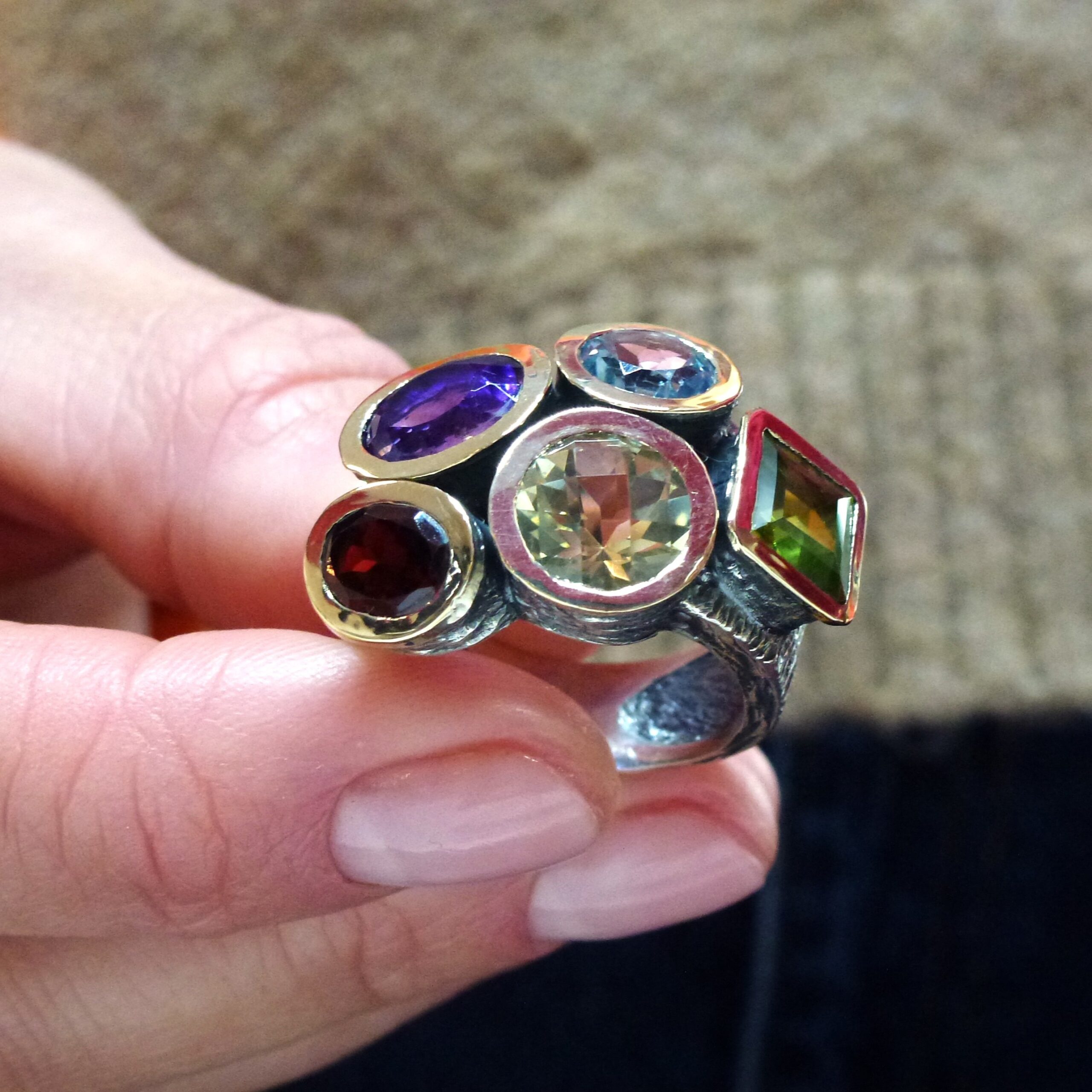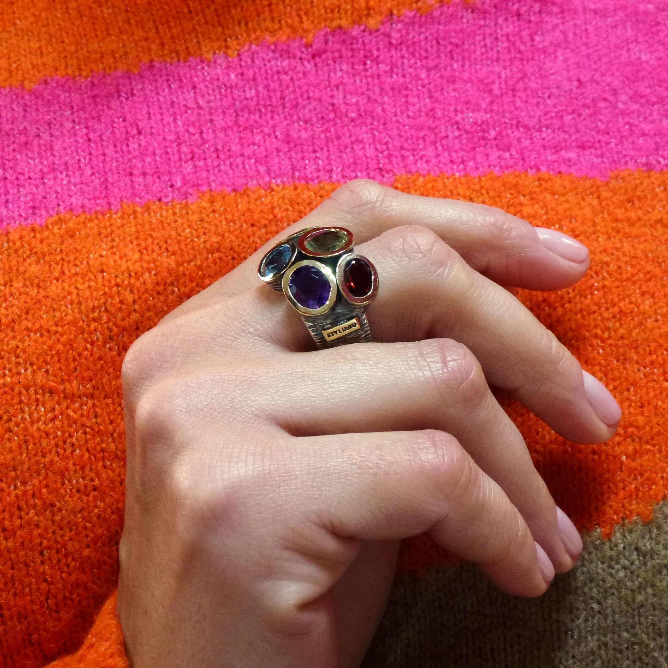 Anillo en Plata de 1ª Ley con Gemas naturales (Peridoto, Amatista, Gnanate, Citrino).