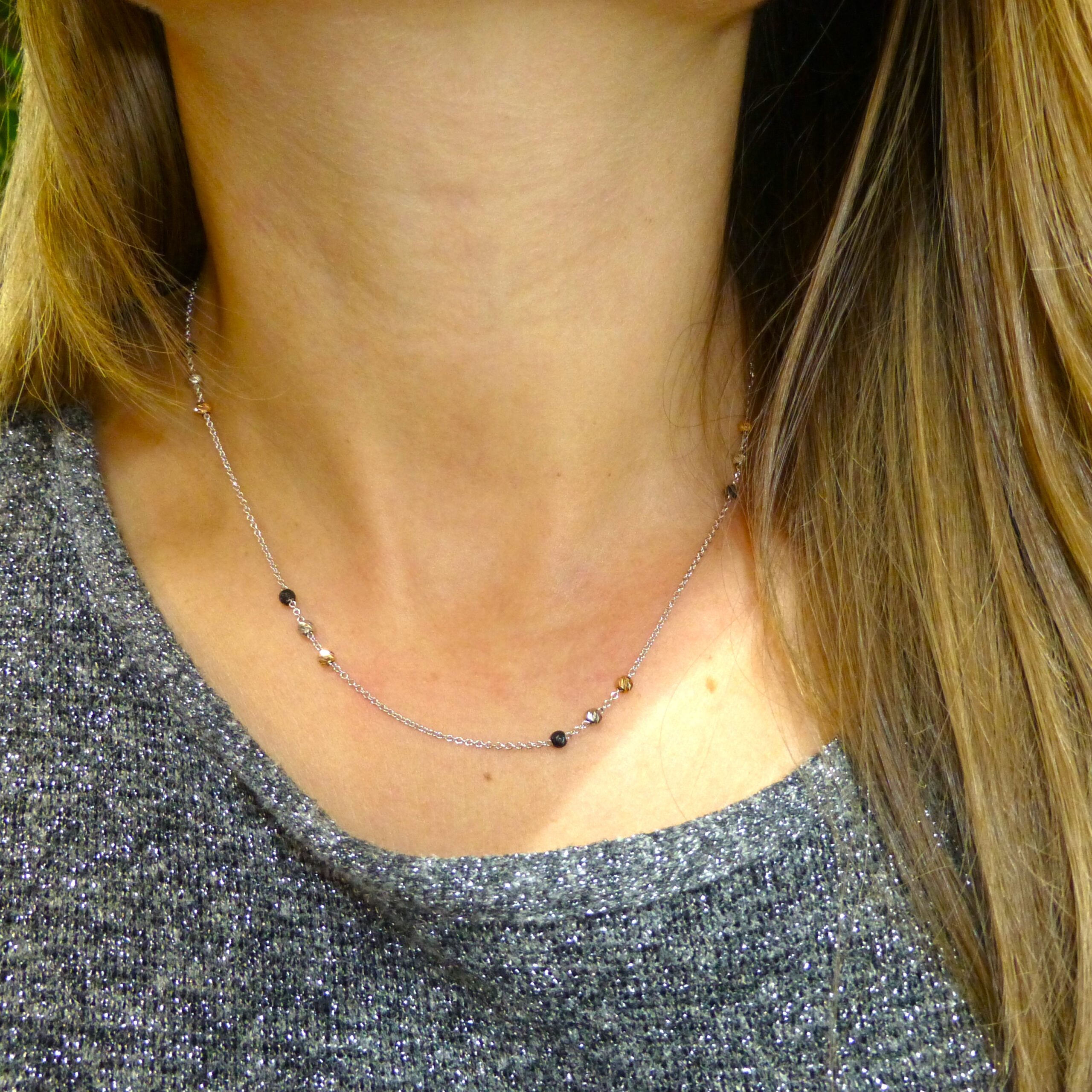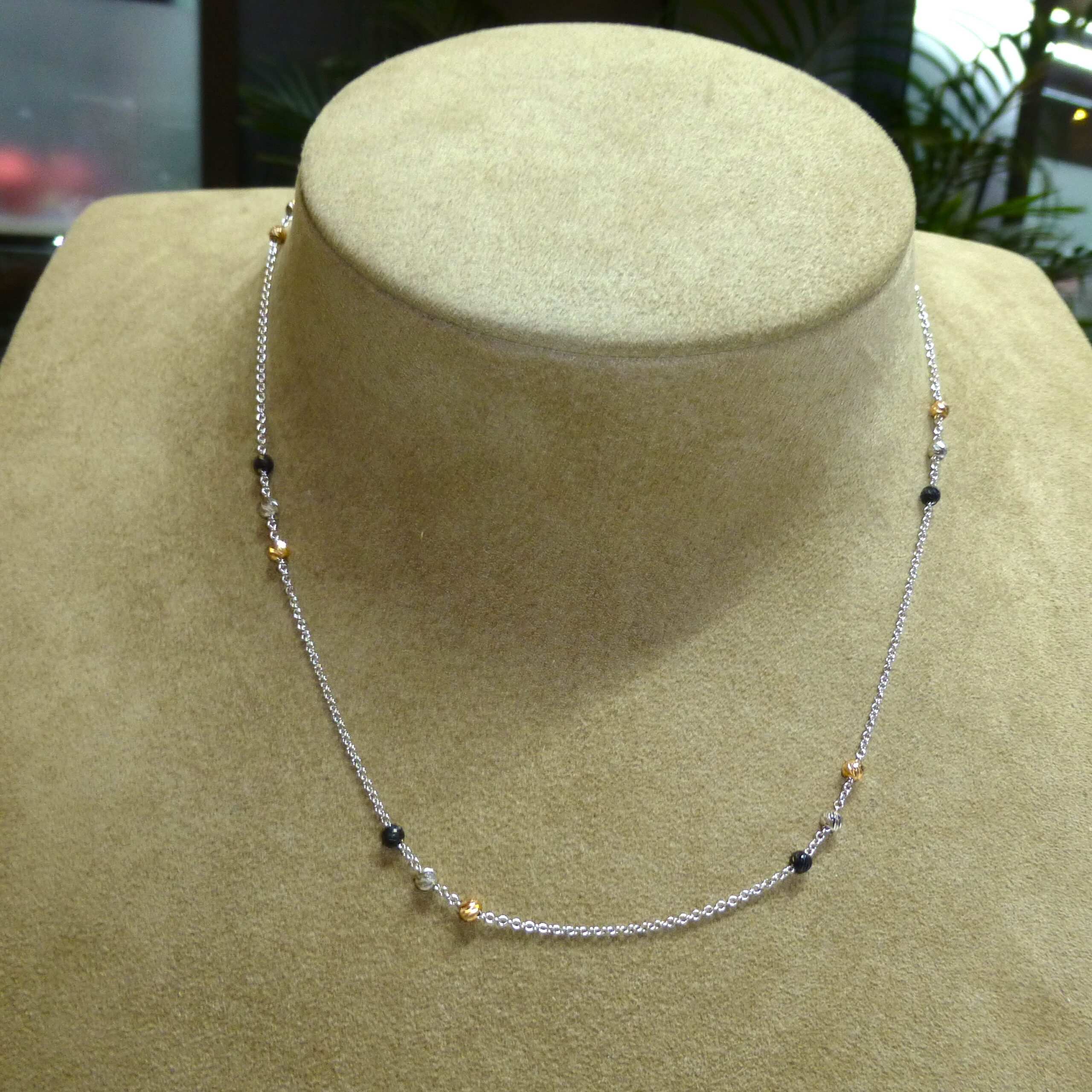 Gargantilla realizada en Oro blanco de 18 k con bolitas tricolor: en Oro, Oro blanco y Rutenio.