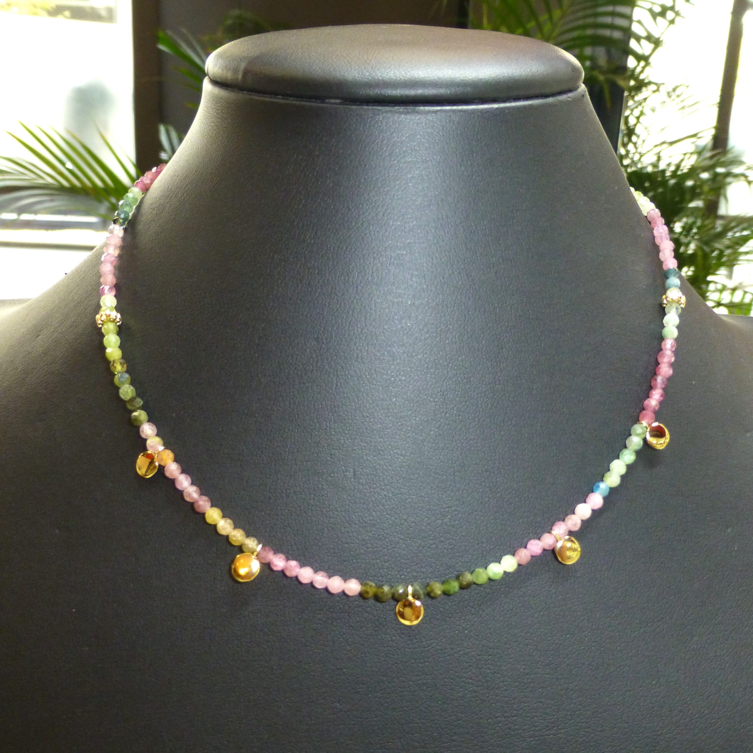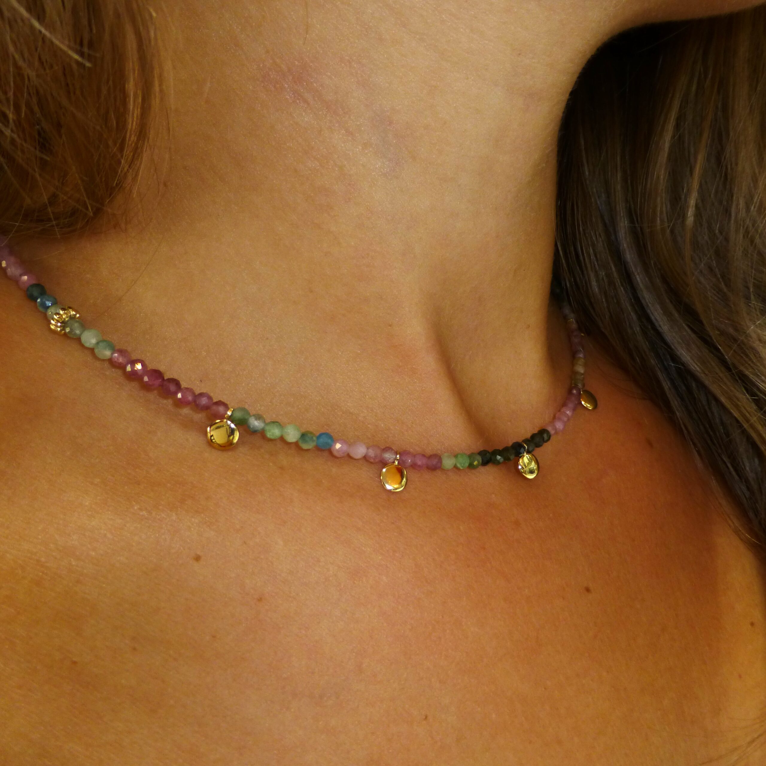 Gargantilla en Plata de 1ª Ley con piedras naturales, turmalinas, y motivos en plata chapados en Oro de 18 k.