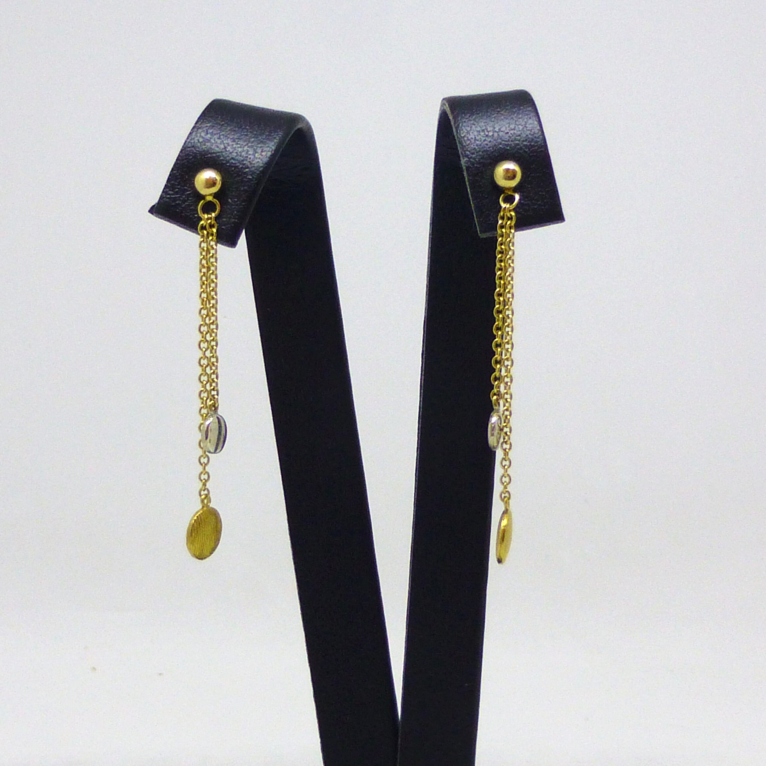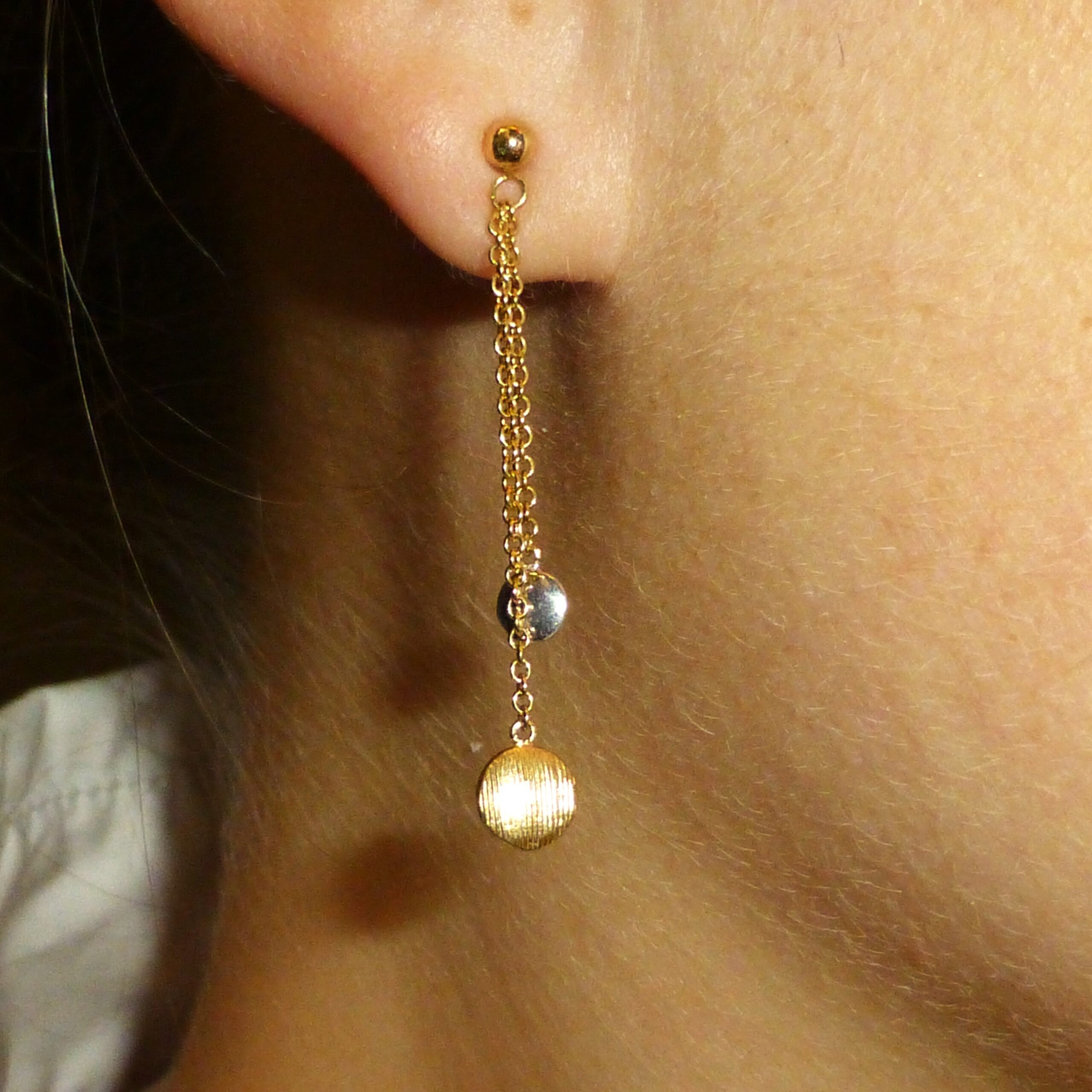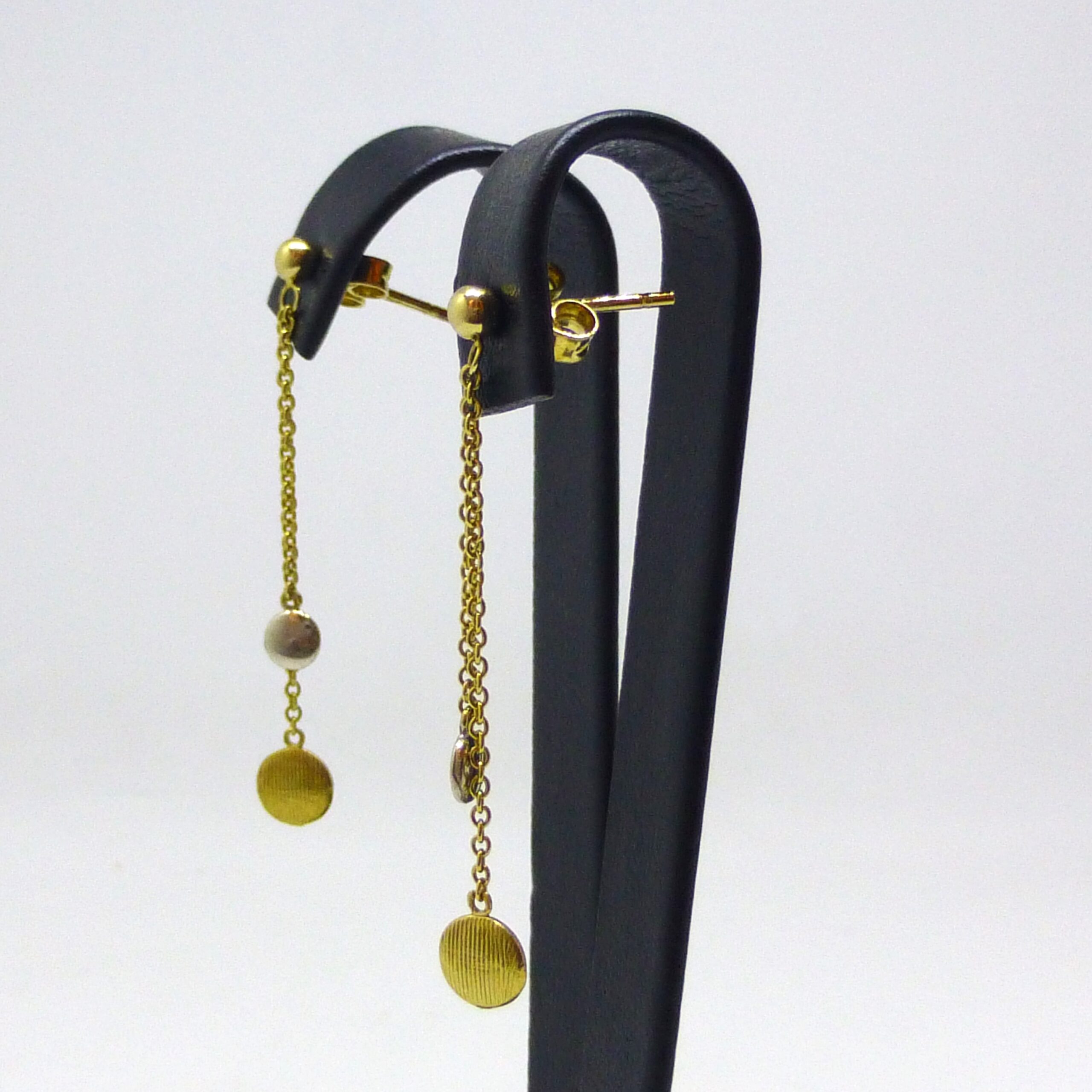 Pendientes largos de Oro de 1ª Ley con cadenas de diferentes longitudes, que terminan con un charm circular.
