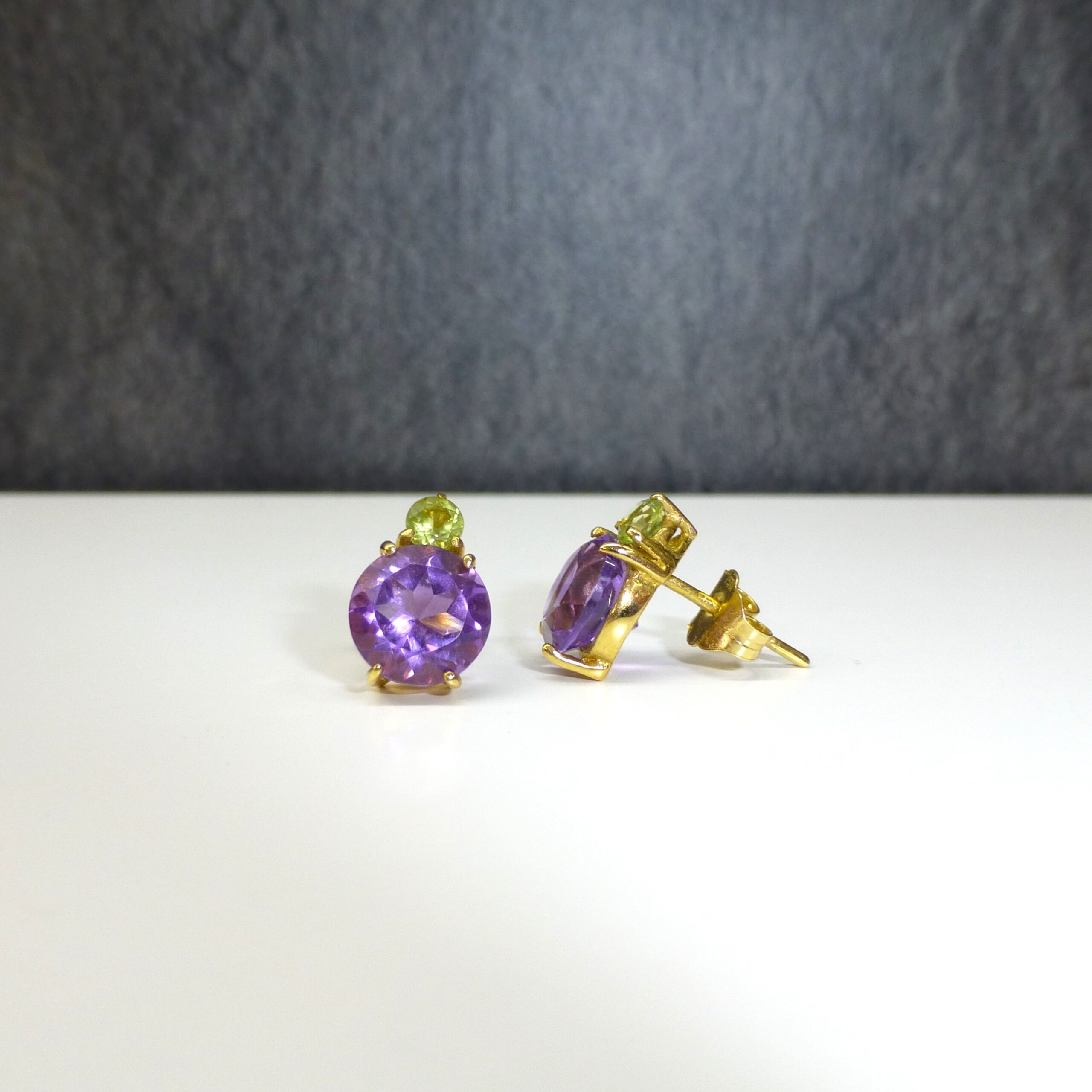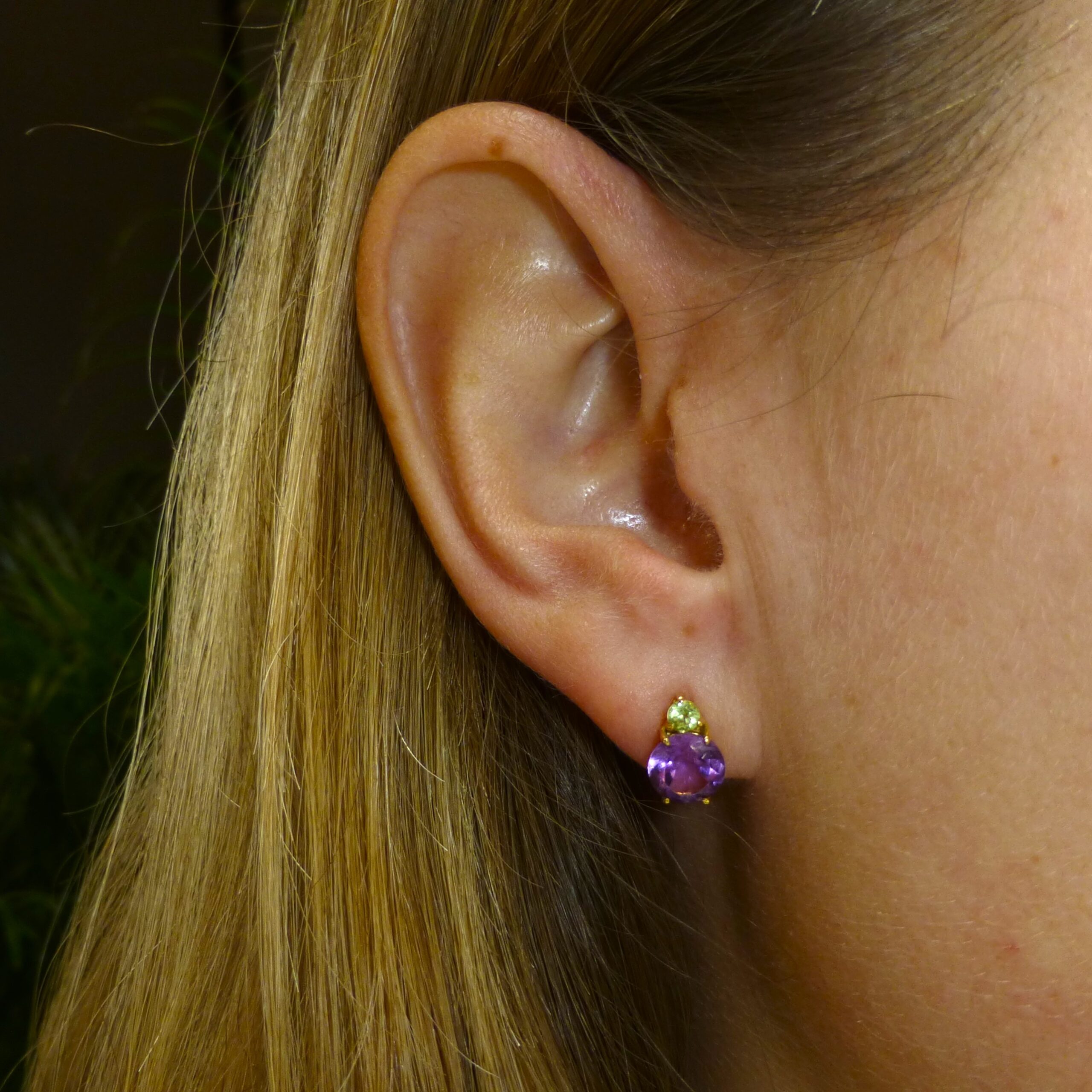 Pendientes realizados en Oro de 1ª Ley con Gemas naturales, tales como Amatista y Peridoto.